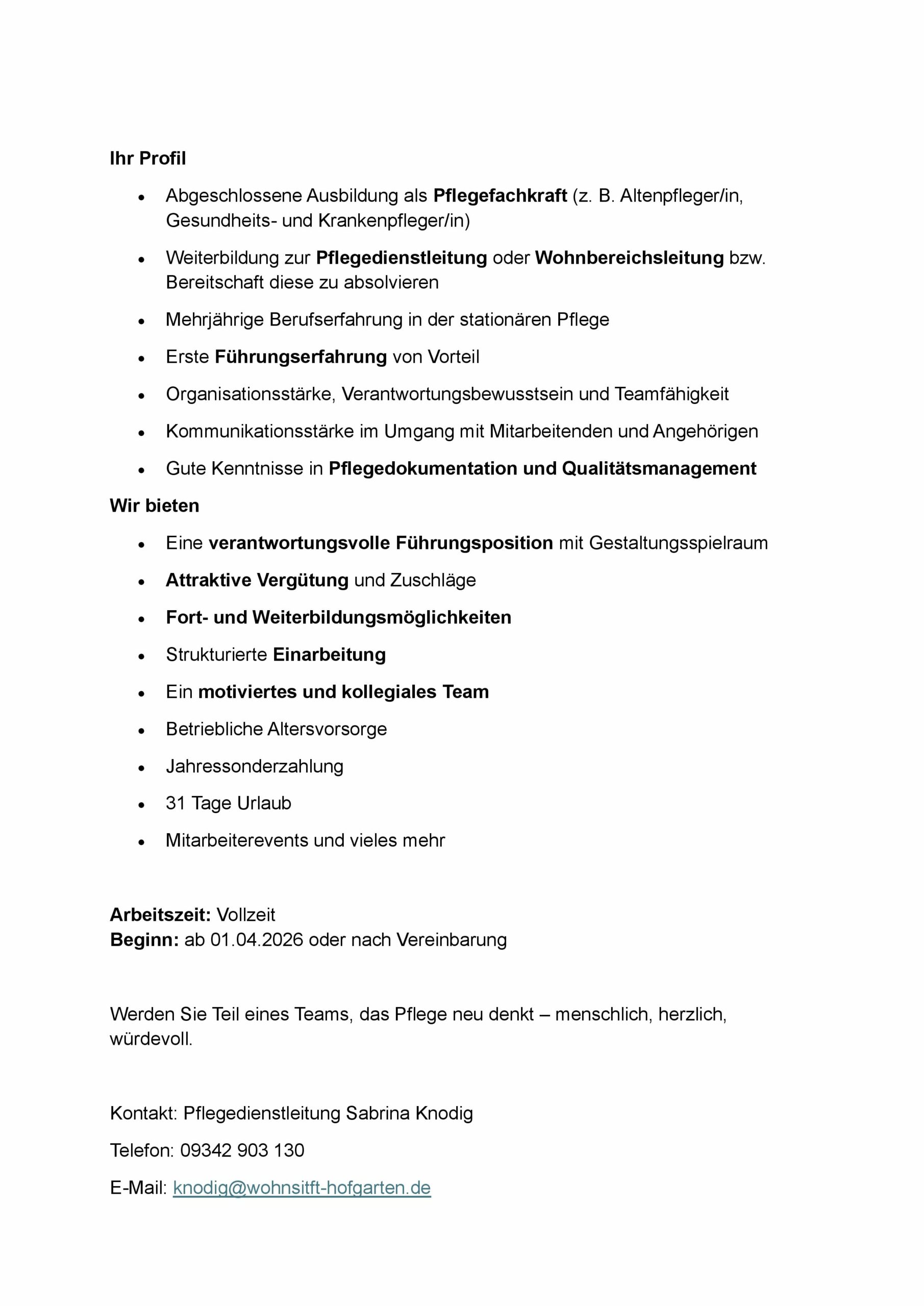 Wohnstift Hofgarten Team Leitung